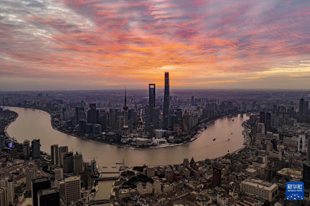 上海陆家嘴朝霞(2022年1月1日摄,无人机照片)。