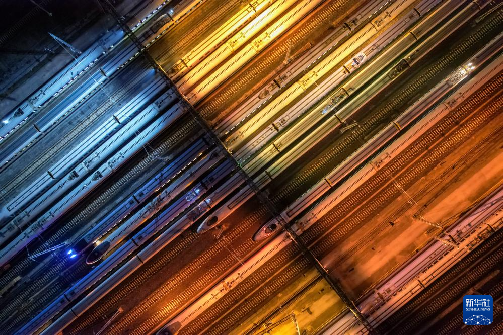 2023年1月6日,动车组列车停靠在贵阳北动车所内(无人机照片)。“十四五”期间,国家铁路完成旅客发送量162亿人次,全国铁路营业里程和高铁营业里程持续跃升,我国建成世界规模最大、先进发达的高速铁路网。