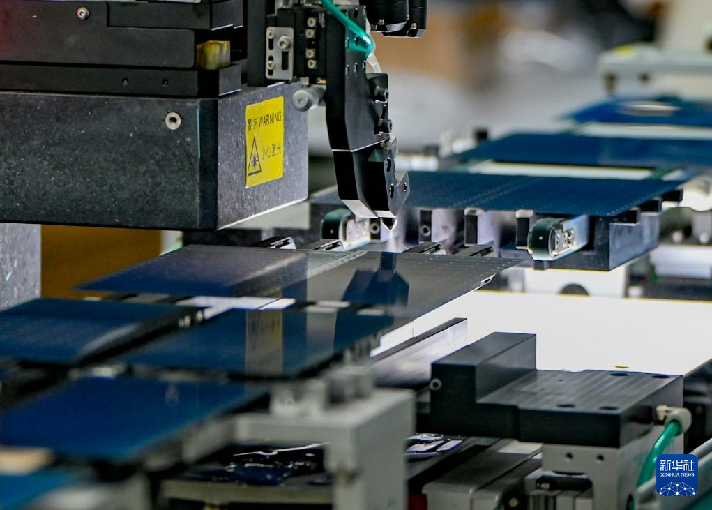 在新疆巴音郭楞蒙古自治州若羌县一家新能源有限公司,全自动划片机在切割光伏电池片(2025年9月22日摄)。2025年,电动汽车、光伏产品、锂电池等“新三样”产品出口规模接近1.3万亿元,比2020年增长3.5倍。
