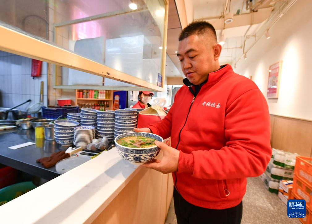 2月27日,在位于北京市朝外街道的老张拉面馆,成奶仓将做好的拉面端给顾客。