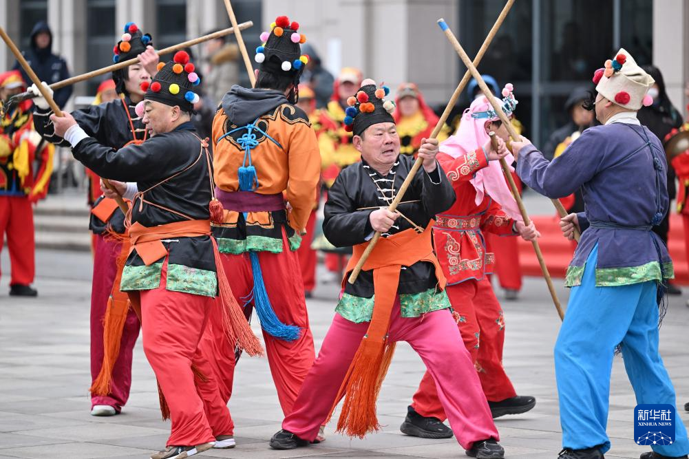 2月28日,天津市北辰区第二十九届“万民同乐大联欢”花会展演活动在双街镇龙顺文化体育产业园举行。活动现场,旌旗招展、鼓乐齐鸣,来自京津冀三地的十多支展演队伍联袂献艺,展现传统民俗文化魅力。