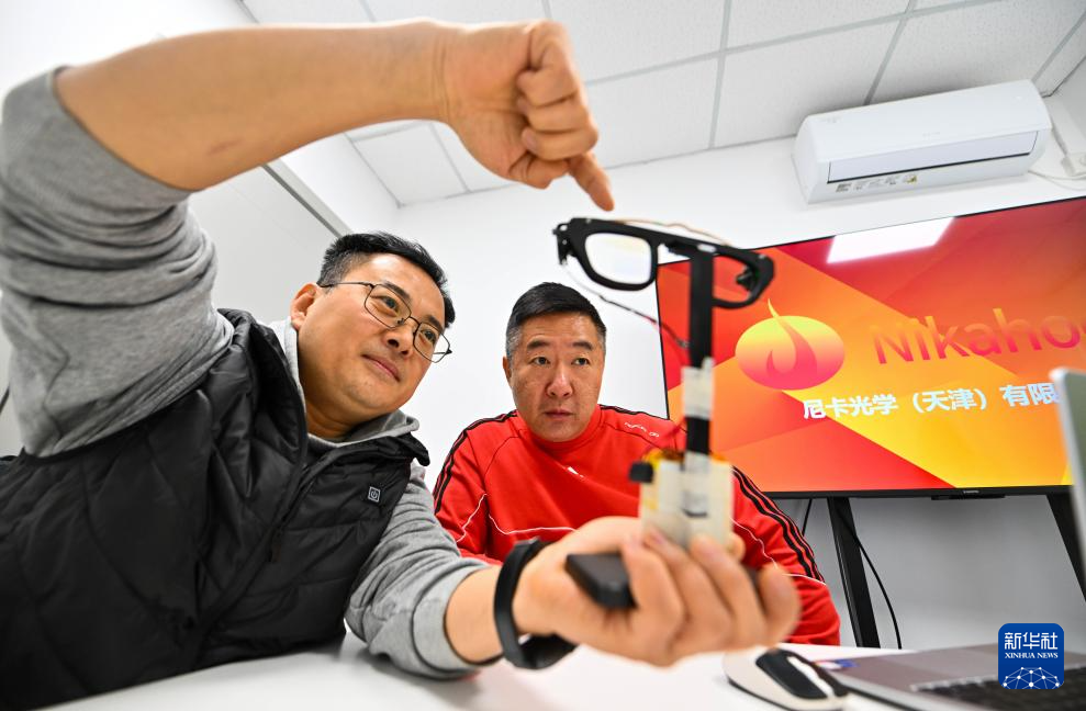 2月28日,在位于天津滨海高新区的尼卡光学(天津)有限公司,工作人员测试一款智能眼镜的原型机。