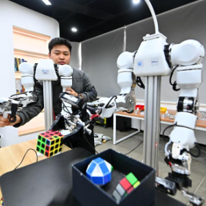 2月27日,在位于天津滨海高新区的天津智易时代科技发展有限公司,工作人员对一款具身机器人进行测试。