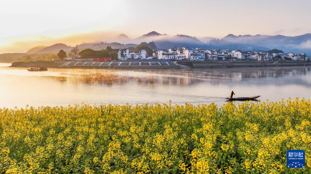 安徽省黄山市歙县新安江畔的油菜花竞相绽放(2025年3月20日摄)。