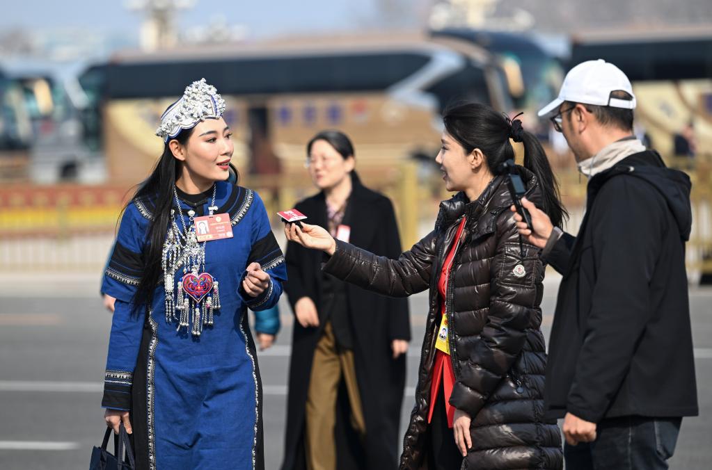 3月8日,全国政协十四届四次会议在北京人民大会堂举行第三次全体会议。这是记者在采访全国政协委员。