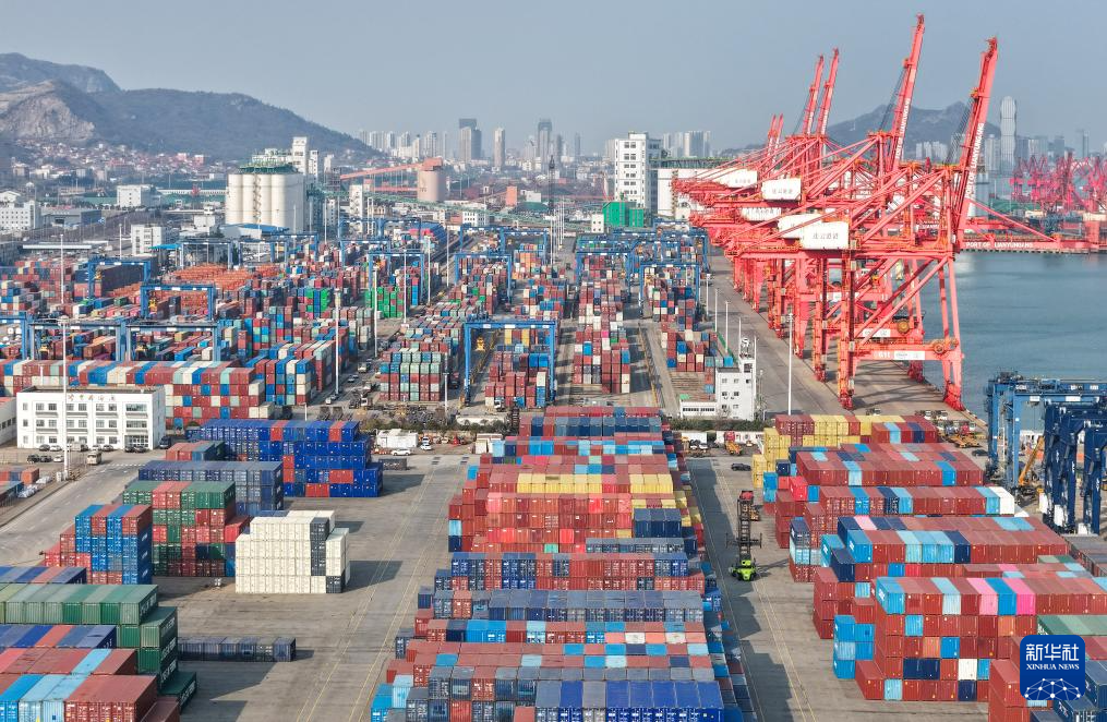 3月10日,在山东港口青岛港,外贸集装箱码头作业一派繁忙(无人机照片)。