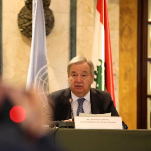 3月14日,联合国秘书长古特雷斯在黎巴嫩首都贝鲁特举行的新闻发布会上讲话。
