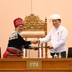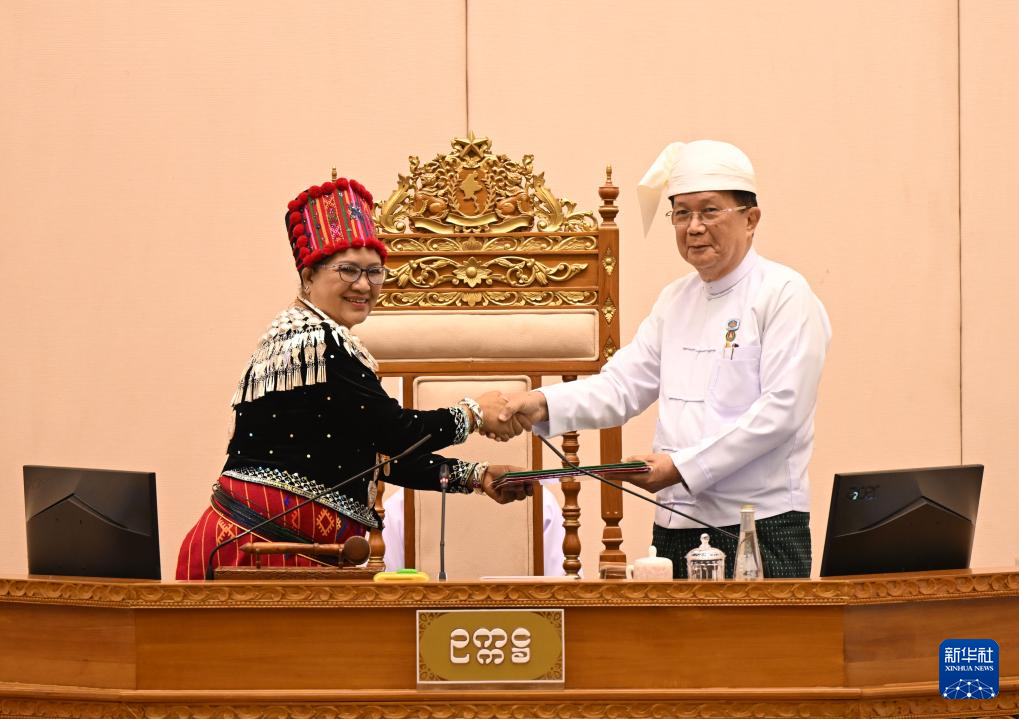 3月18日,在缅甸内比都,昂林兑(右)出席第三届民族院(上议院)第一次会议。