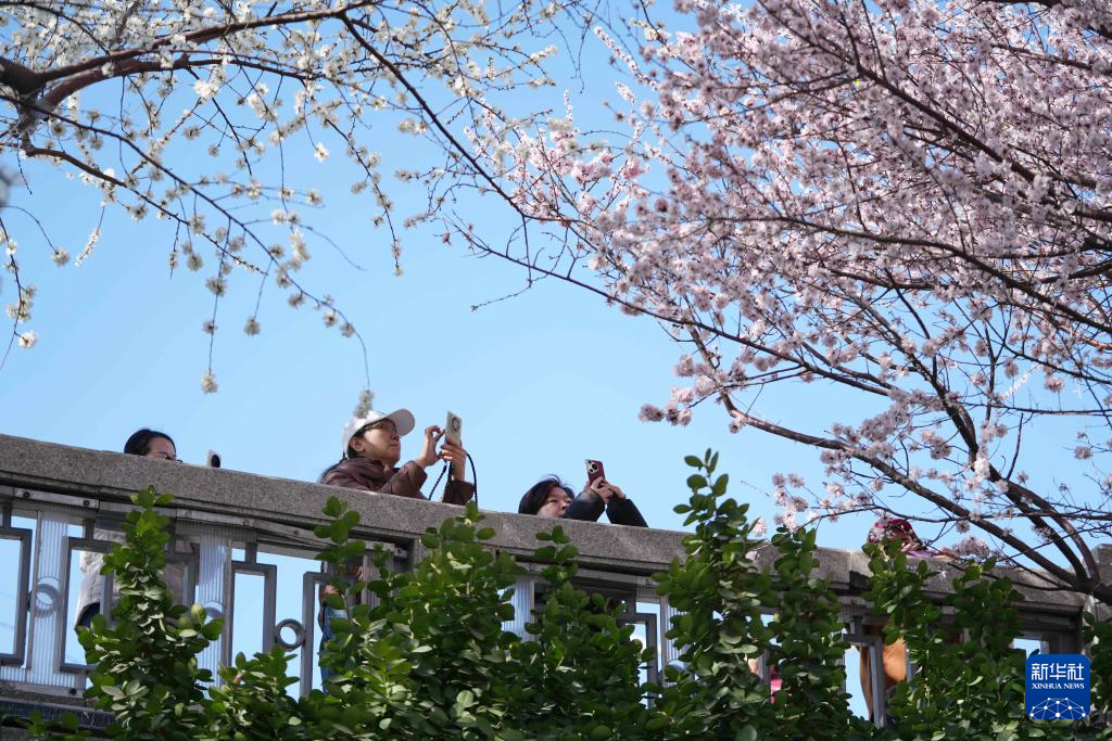 3月18日,行人在阜成门桥头拍摄绽放的桃花。