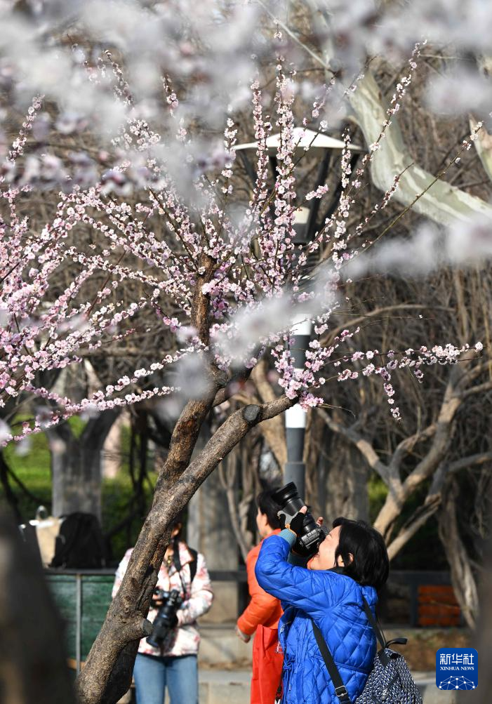 3月21日,市民在河北省石家庄市新华区水上公园拍照。