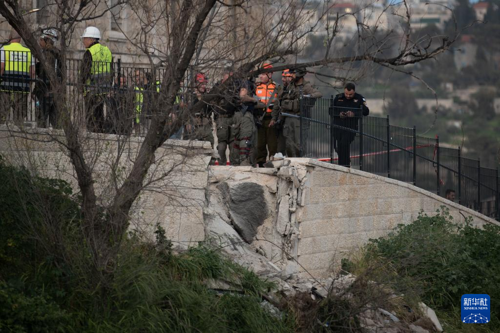 3月20日,在耶路撒冷老城附近,应急反应人员在一处被导弹碎片波及的地点开展工作。