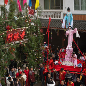 3月20日,四川省兴文县九丝城镇建武村,演员在巡游活动中表演木台铁桩戏《山伯访友》。