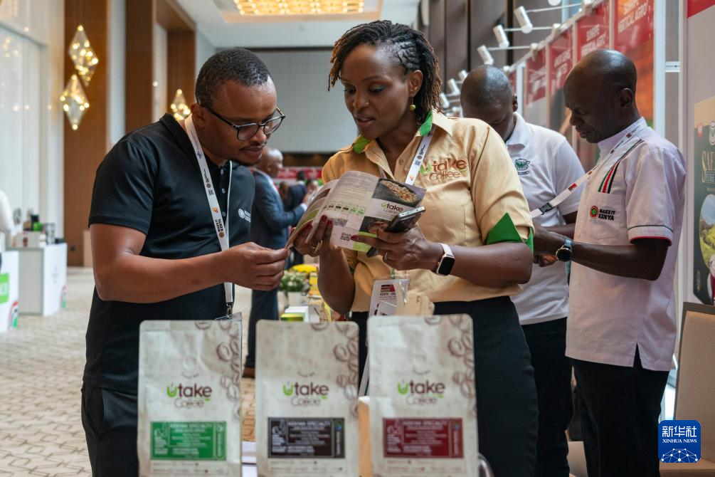 3月23日,与会者在肯尼亚内罗毕举办的肯尼亚享受零关税出口中国商品展示会现场了解肯尼亚咖啡。