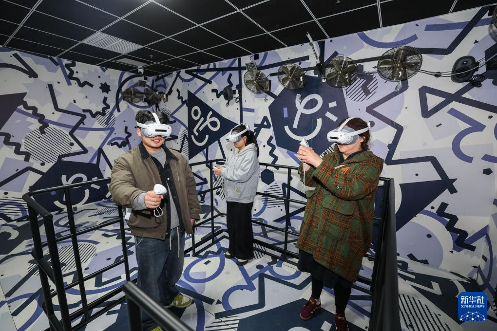 3月24日,在嘉兴市南湖区“翼时空·嘉兴1921”机遇时空体验馆内,游客佩戴VR设备在虚拟场景中互动体验。