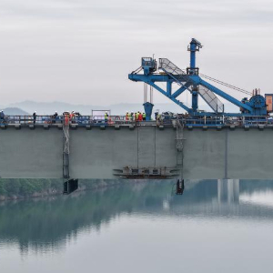 3月25日,在成达万高铁嘉陵江特大桥施工现场,最后一段钢箱梁吊装施工中(无人机照片)。