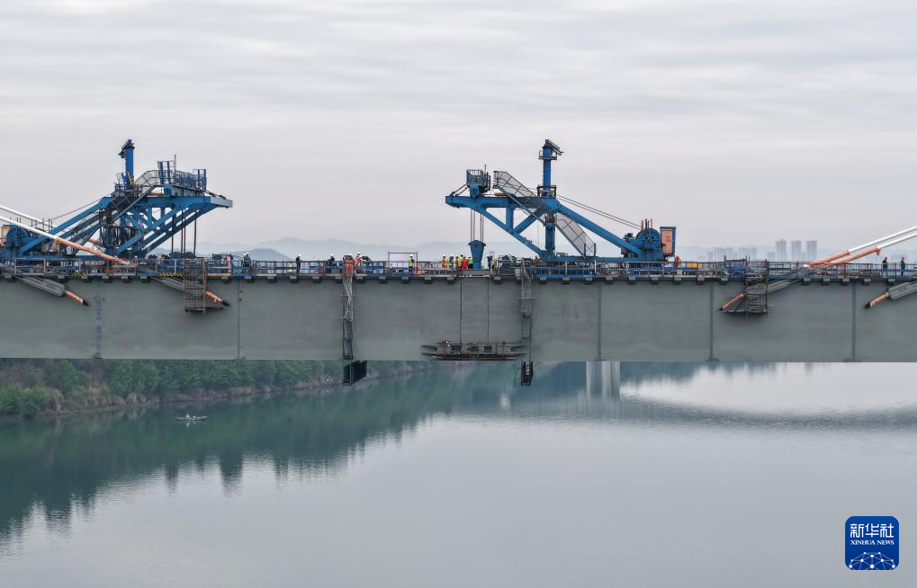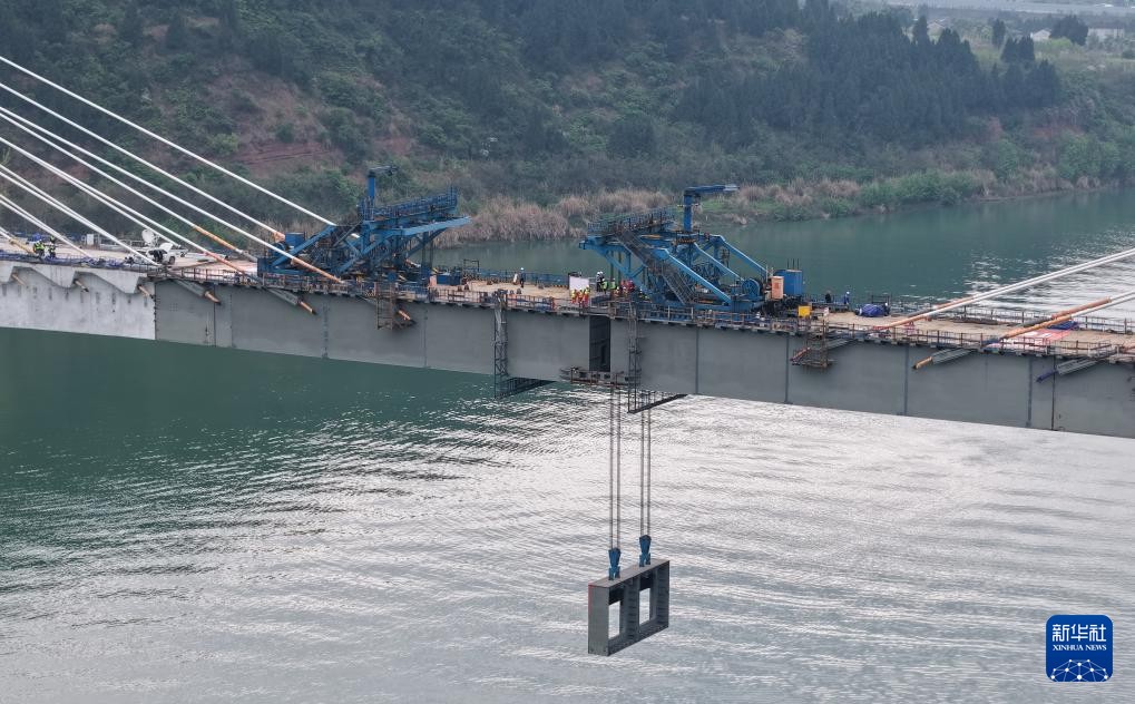 3月25日,成达万高铁嘉陵江特大桥施工现场,最后一段钢箱梁抵达吊装位置(无人机照片)。