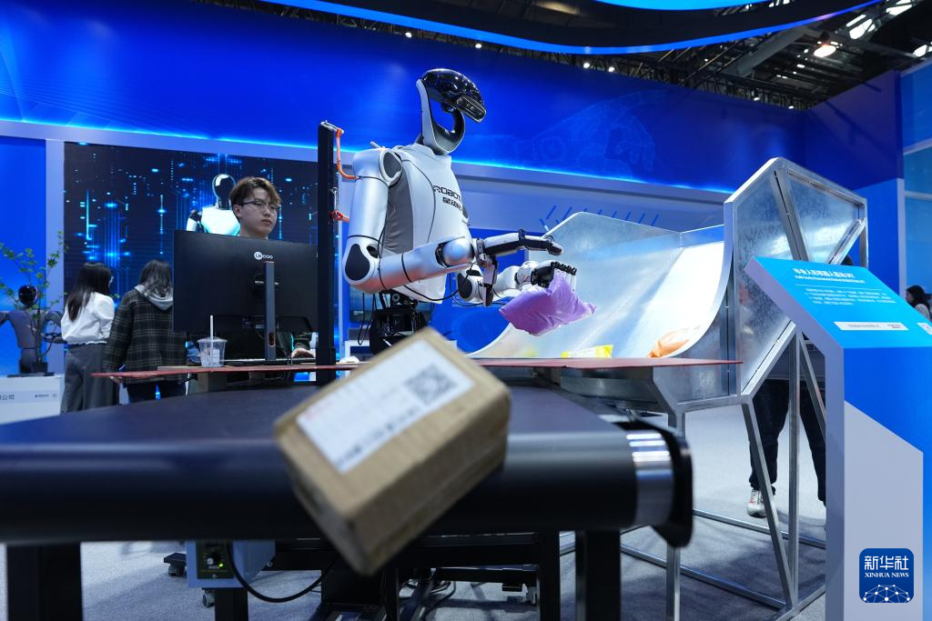 在中关村展示中心常设展上,一台半身人形机器人在进行包裹分拣展示(3月25日摄)。