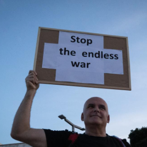 3月28日,在以色列特拉维夫一处广场,一名男子手持标语参加反战集会。