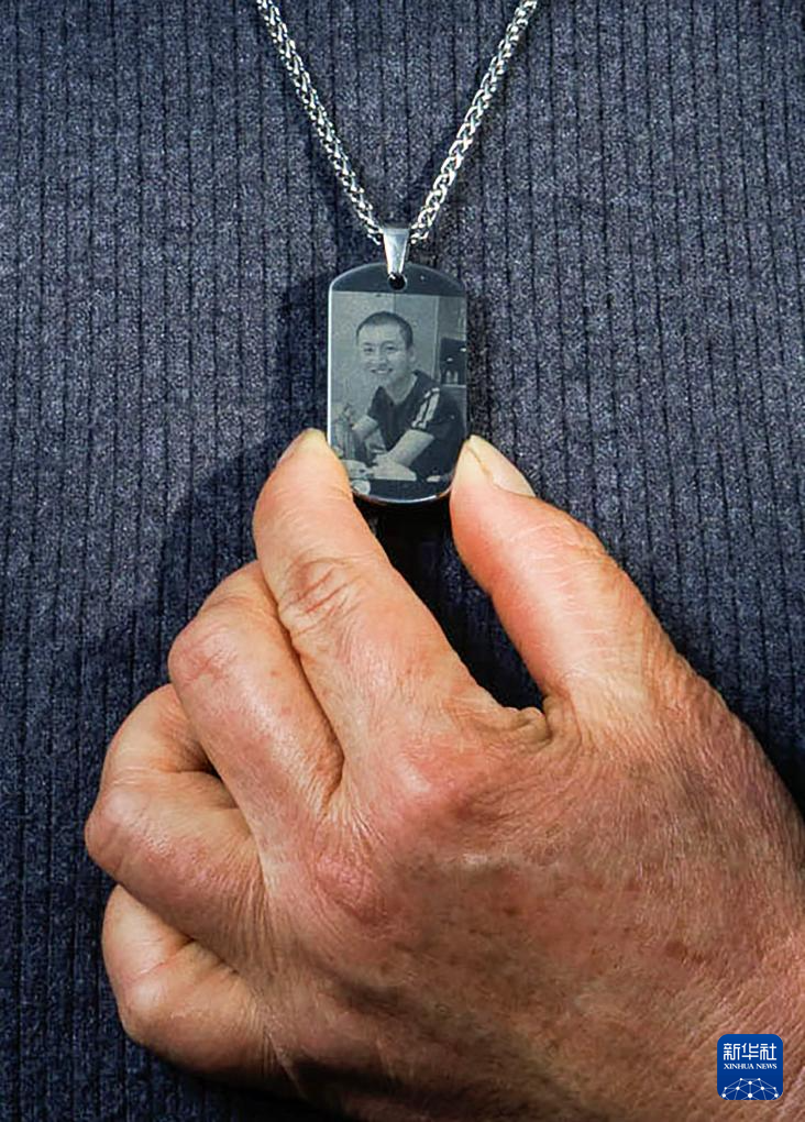肖思远的母亲刘利霞佩戴着用儿子照片制作的纪念项链(2026年1月4日摄)。