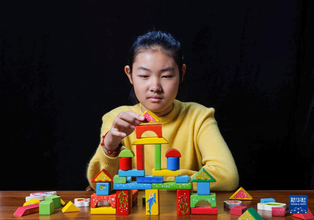 张超的女儿张上明珠在摆放父亲送给她的积木(2026年1月4日摄)。由于张超牺牲时她刚两岁,她对父亲的记忆已经很模糊了,她的妈妈说父亲常在休息时和她搭积木、为她读童话书。
