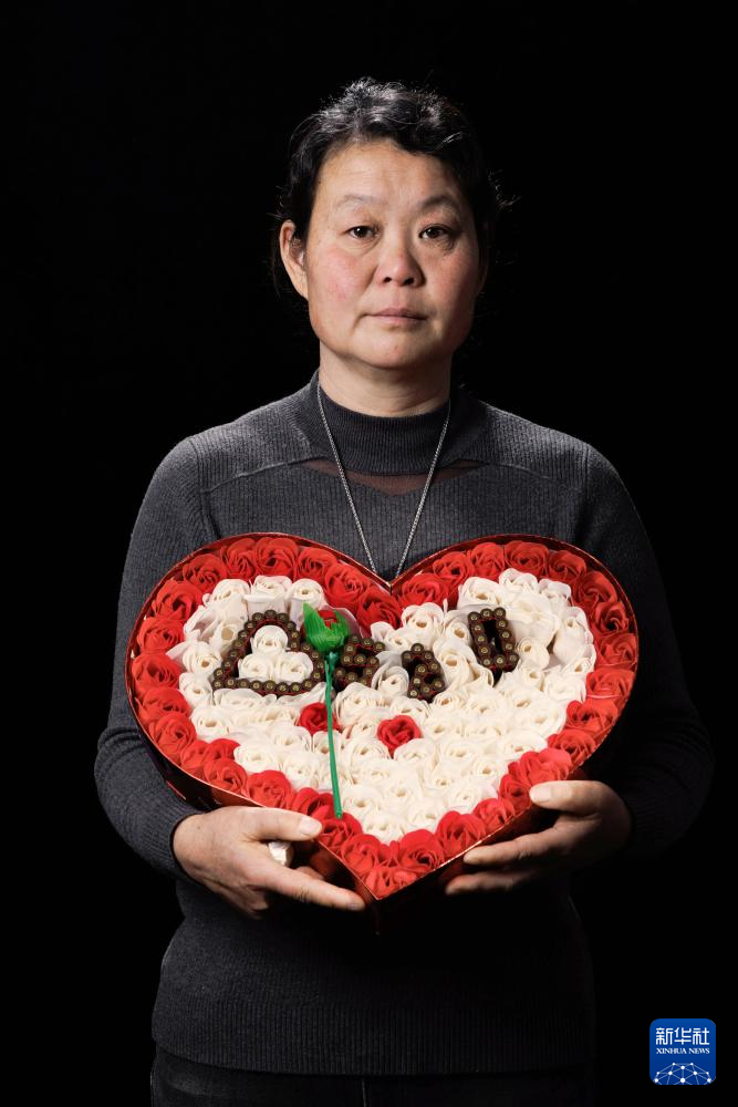 肖思远的母亲刘利霞怀抱儿子制作的母亲节礼物,子弹壳在玫瑰花组成的心形中拼出“520”(我爱您)字样(2026年1月4日摄)。