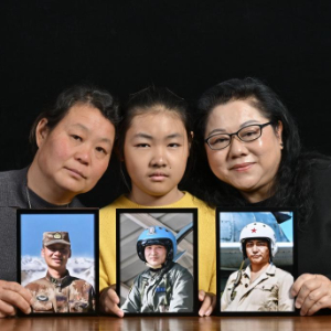 王伟的妻子阮国琴(右)、张超的女儿张上明珠(中)、肖思远的母亲刘利霞手捧烈士照片合影(2026年1月4日摄)。