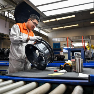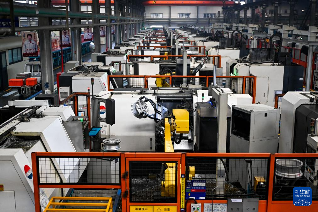 4月1日,工人在包头盛泰汽车零部件制造有限公司铝合金轮毂生产线上作业。