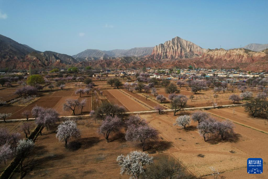 这是4月3日在甘肃省东乡县唐汪镇拍摄的杏园风光(无人机照片)。