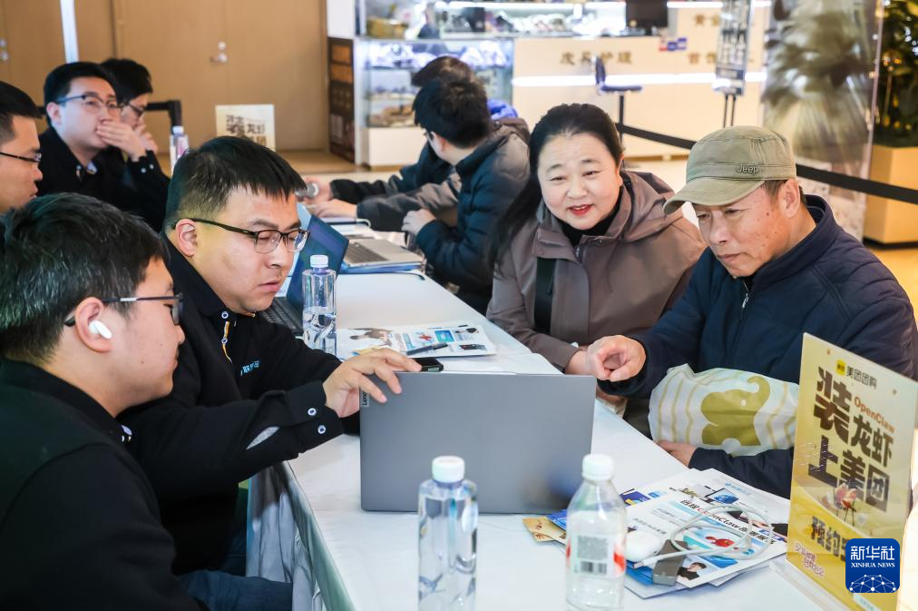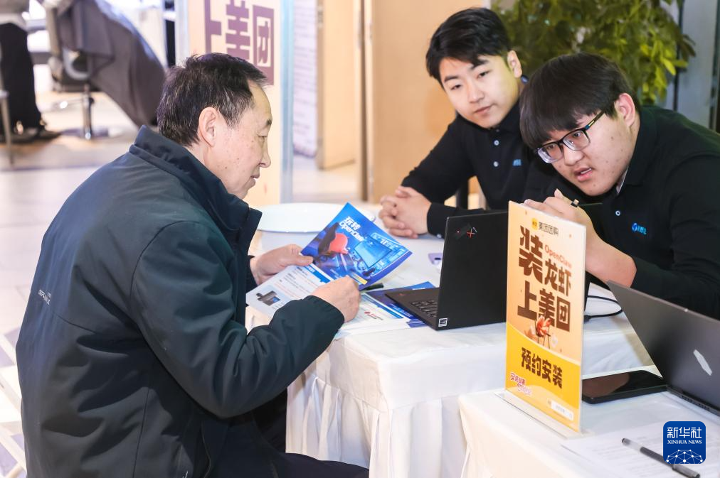 3月13日,在北京市一家商场内,对“龙虾”智能体感兴趣的市民在美团组织的安装“龙虾”活动上进行咨询。