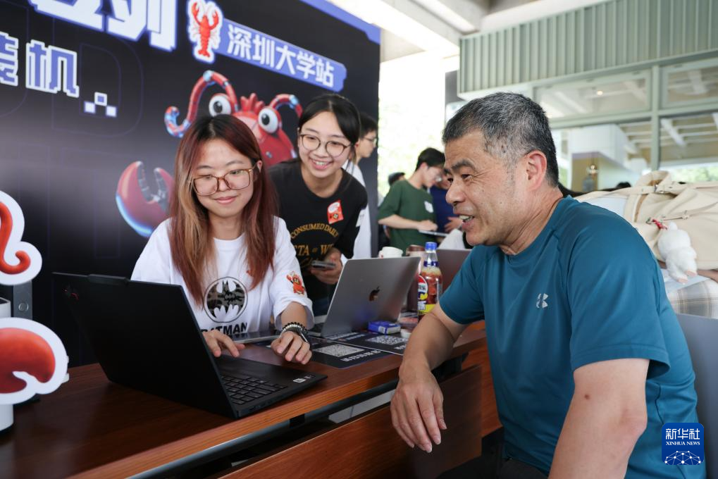 3月19日,“腾讯AI百校行高校龙虾专列”深圳大学站活动现场,一名学生(左)在志愿者的指导下安装腾讯AI智能体Workbuddy。