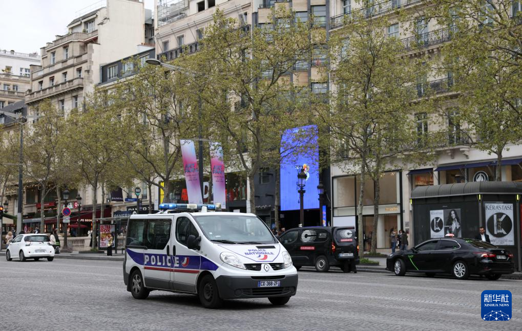 4月2日,在法国巴黎,警车行驶在法国巴黎香榭丽舍大街。