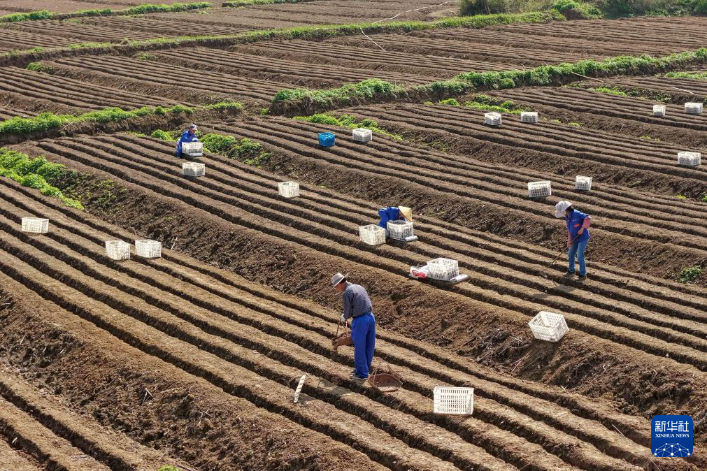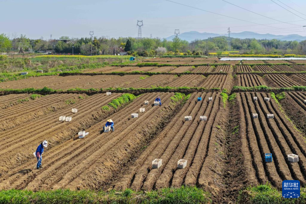 4月2日,在安徽省铜陵市义安区天门镇,农民在姜田里劳作(无人机照片)。