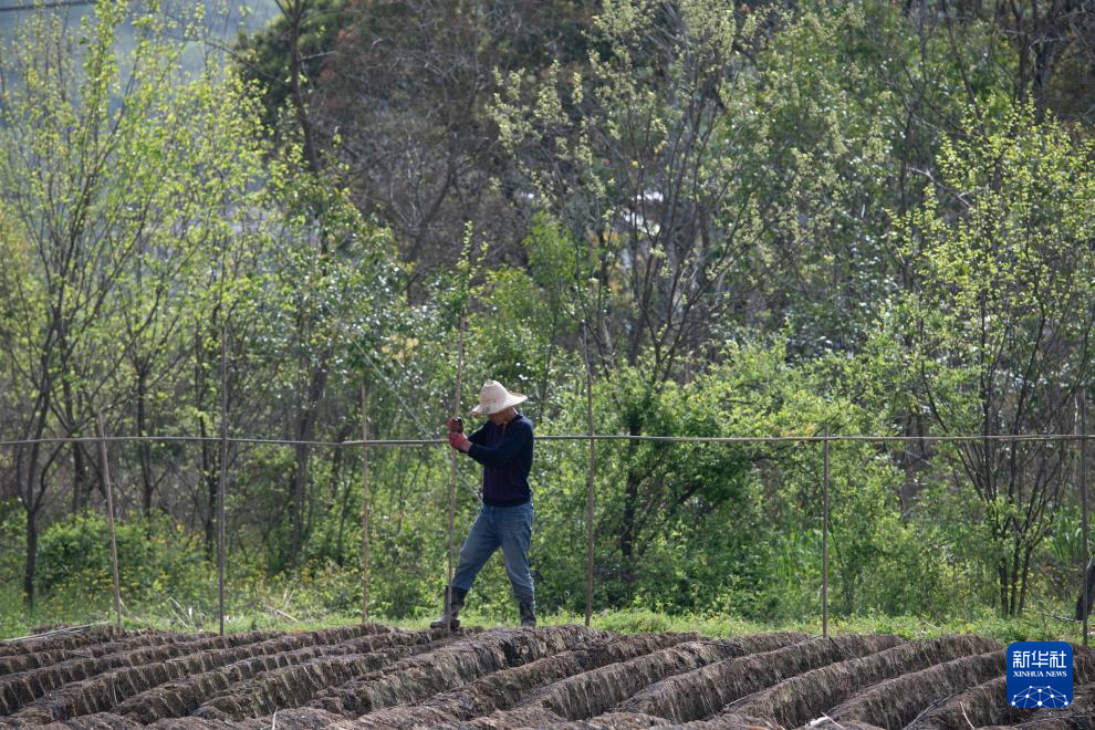 4月5日,在安徽省铜陵市郊区大通镇大院村,农民给种下的铜陵白姜搭建姜棚。