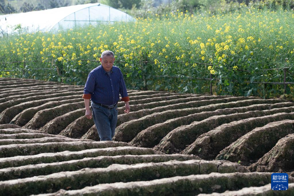 4月5日,在安徽省铜陵市郊区大通镇大院村,农民在姜田里巡看。