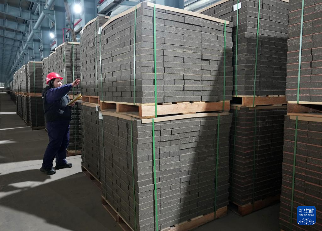 4月9日,工人在河北省迁安市一家以钢渣等固废为原料生产“钢砖”的企业成品车间核对产品批号。