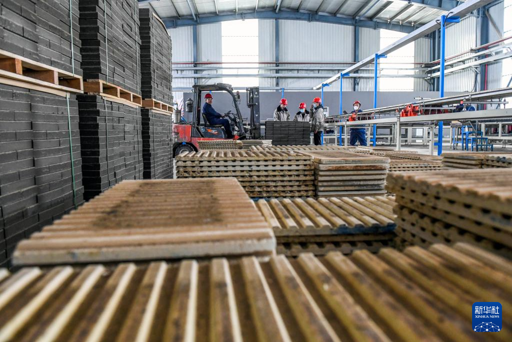 4月9日,工人在河北省迁安市一家以钢渣等固废为原料生产“钢砖”的企业生产车间工作。