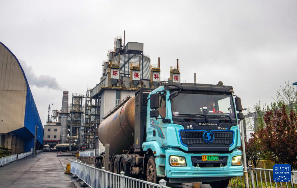 4月9日,运输车辆在河北省迁安市一家以工业固废为原料生产替代传统水泥的高性能混凝土胶凝材料企业厂区运送产品。