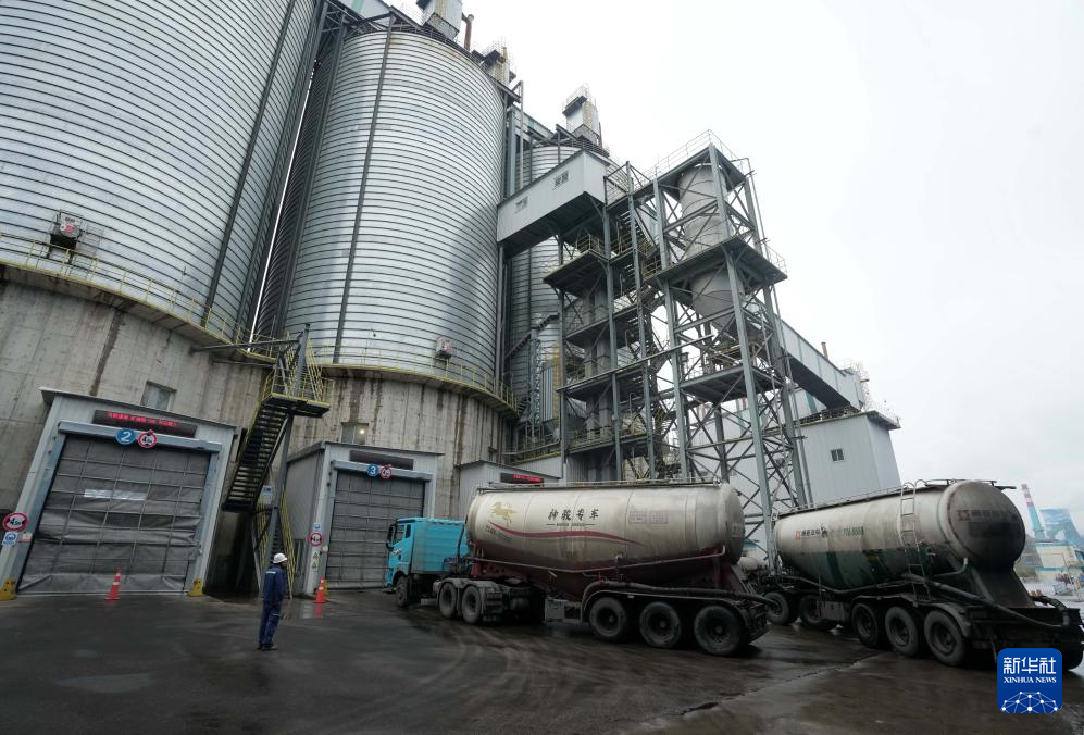 4月9日,运输车辆在河北省迁安市一家以工业固废为原料生产替代传统水泥的高性能混凝土胶凝材料企业厂区等待装载产品。