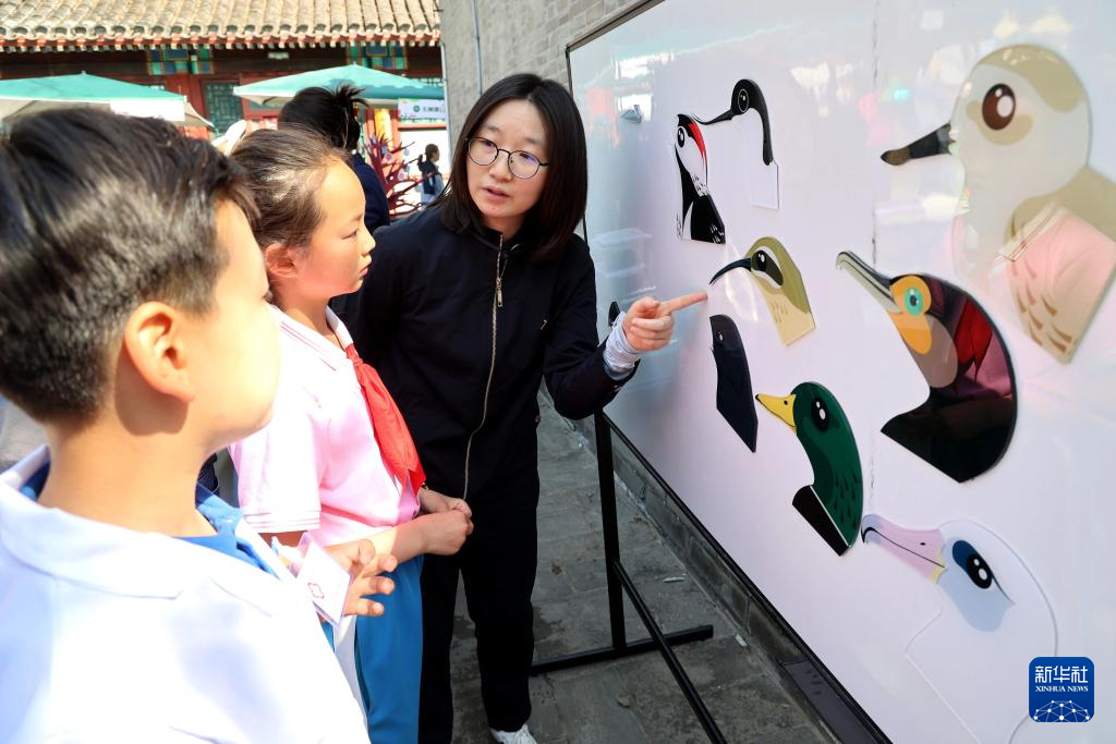 4月11日,工作人员(右一)在北京市颐和园进行科普宣传。