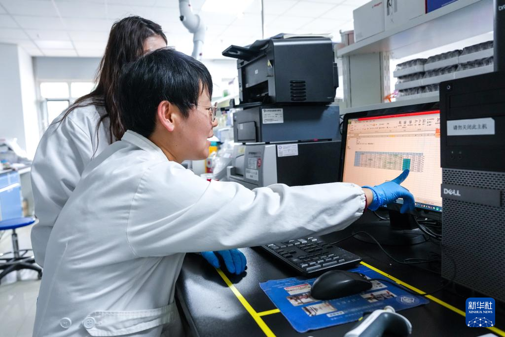 4月15日,在中国农业科学院兰州兽医研究所口蹄疫与新发病流行病学团队诊断间,科研人员在进行样本检测作业。