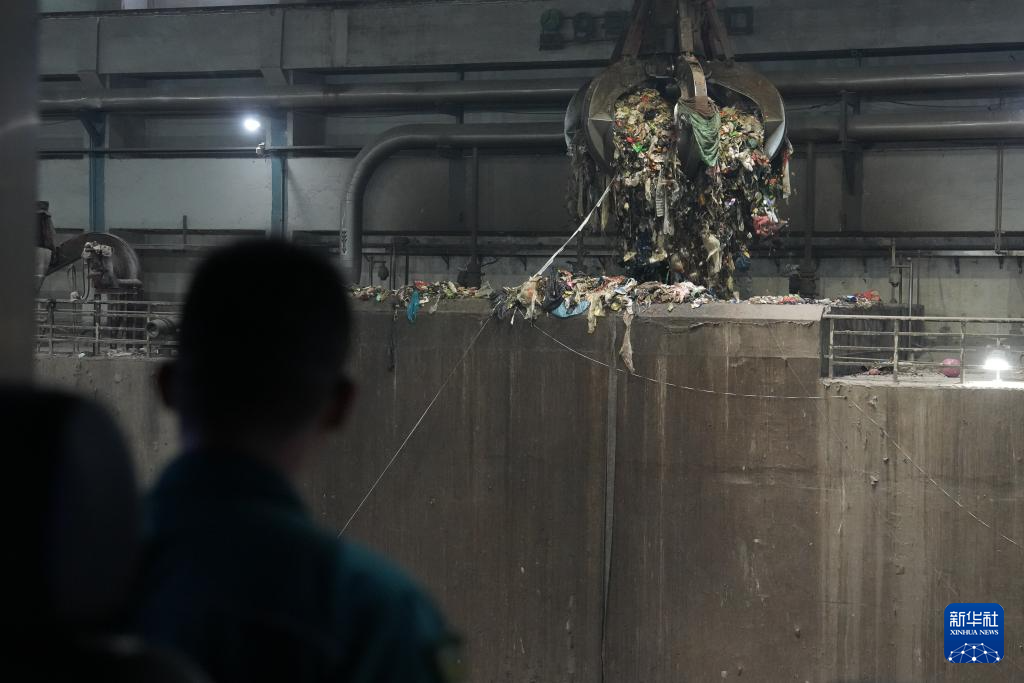 4月22日,在军信股份黑麋峰环保园区,工作人员操作抓斗将垃圾运至焚烧炉内。