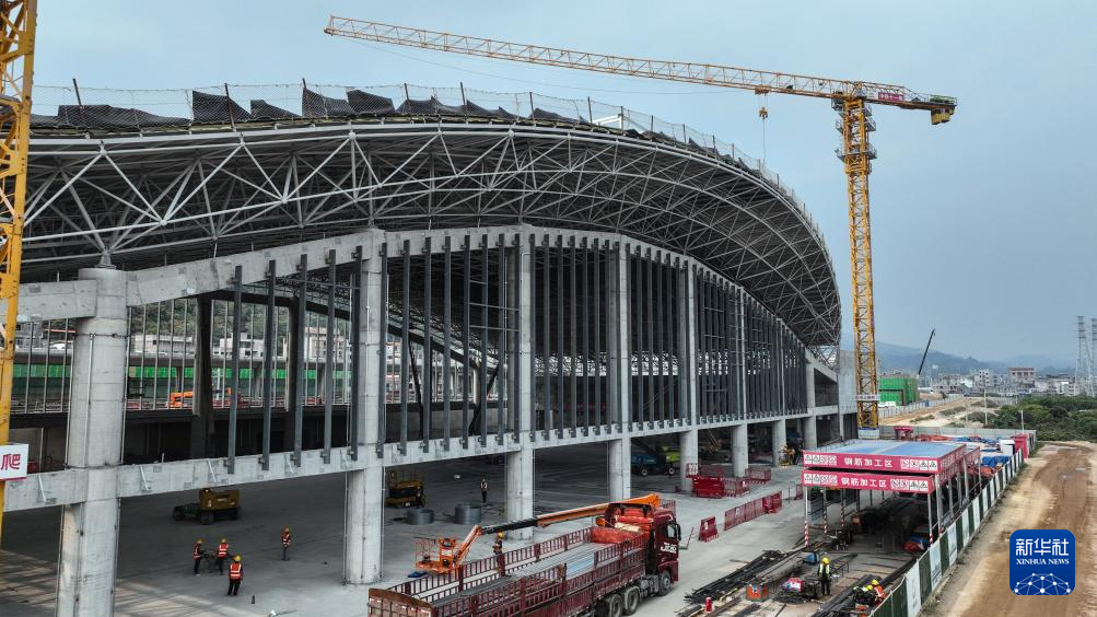 中铁十一局的施工队在岑溪东站开展封顶作业(3月27日摄,无人机照片)。