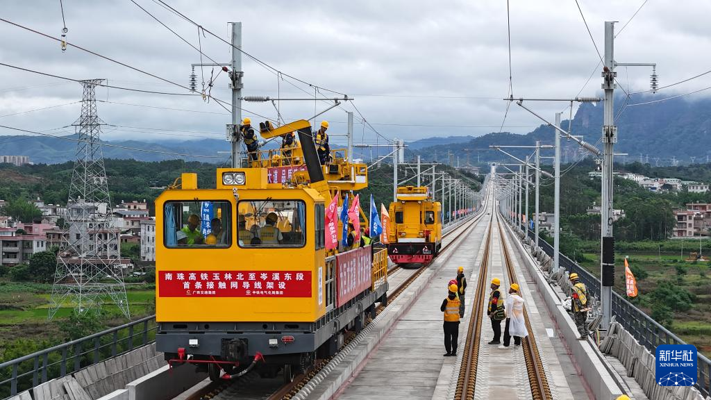 4月23日,南珠高铁玉岑段首条接触网导线在广西玉林北至容县南区间成功架设(无人机照片)。