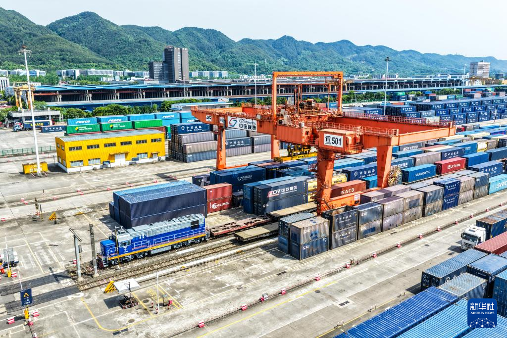 4月23日,一列装载汽车配件、机械机具等货物的中欧班列在重庆团结村站顺利发车(无人机照片)。