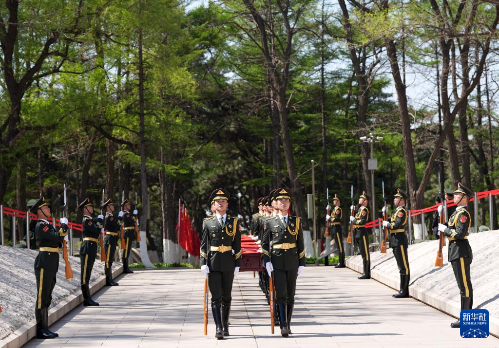 4月23日,在沈阳抗美援朝烈士陵园,礼兵护送志愿军烈士棺椁缓步进入纪念广场。