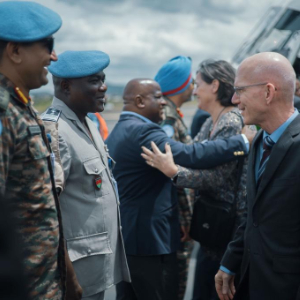 4月24日,联合国刚果(金)稳定特派团(联刚稳定团)团长詹姆斯·斯旺(前右)抵达刚果(金)北基伍省首府戈马。