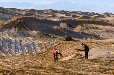一场冬雪过后,在甘肃省酒泉市阿克塞哈萨克族自治县的库姆塔格沙漠边缘,施工人员忙着铺设沙障,有序推进甘肃省酒泉市祁连山北麓阿克塞片区水源涵养与生态保护修复项目。