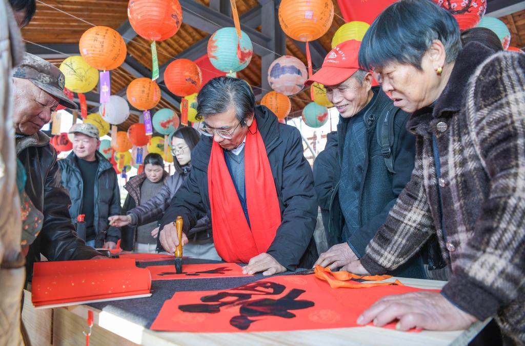 12月28日,书画爱好者在民俗游园会活动现场给人们写福字。