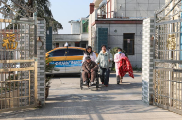 12月28日,在江苏省海安高新区隆政街道德兴村亲上亲养老小院,护理人员迎接外出医院检查身体的老人归来。