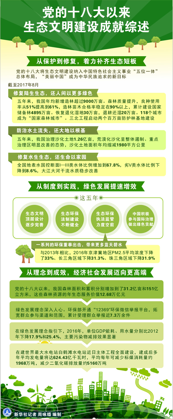 党的十八大以来,在以习近平同志为核心的党中央领导下,绿色发展、绿色生活理念深入人心,中国经济社会发展更加充满活力,生态文明建设推动中华民族在伟大复兴征程中阔步前进。